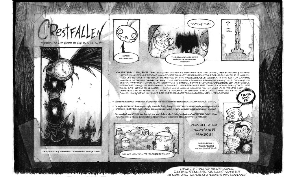 Crestfallen! So where did the idea for Crestfallen come from? Basically my daydream of the coolest conceivable place to live. A big ol’ hunk of Old Europe nestled in the Pacific Northwest and bursting with freaky legends, weirdo secrets, and literal monsters. Paradise. But even in my daydreams I know what regular humans would do with such a cool place. It would become a suffocating tourist trap within seconds of discovery.