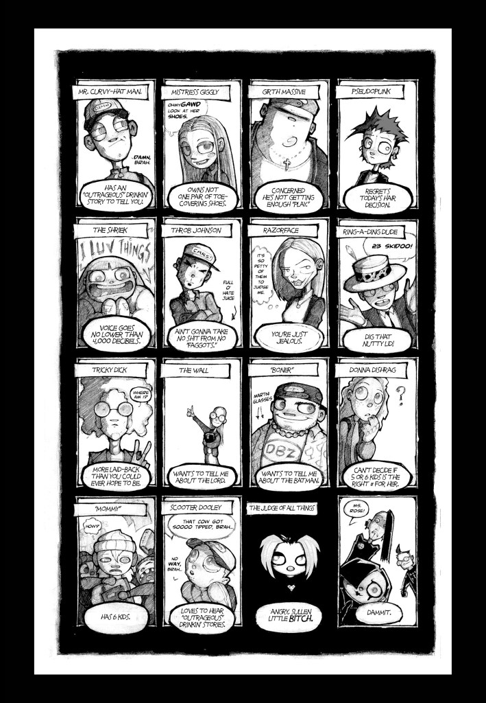 This is the cleaned-up version I did for digital sales a while back. The original print version had THE SHRIEK named “LARDLOUD,” and the description read “Thinks volume compensates for obesity.” Yikes. That for sure chucks Sera into the Unlikable Zone. Hats and haircuts are fair game, but who wants to read about a character that tears into people for their weight? Pretty confident about that change. 2001 Aaron messed up.