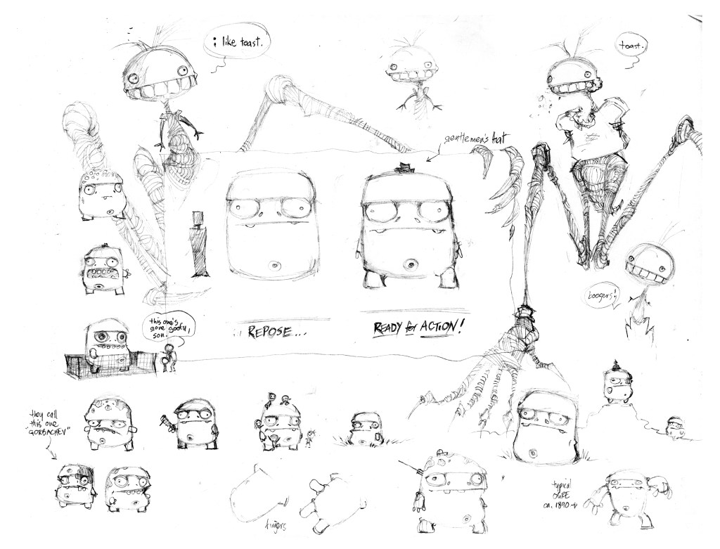 Still kind of like that goblin design down there, too. The first sketches had them jumping along on these big bony hands instead of their usual leg spikes. Makes them look a bit like plucked chickens with zombie arms. Real Re-Animator stuff going on here!