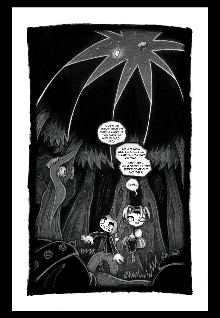 Imagine spending this much time carefully detailing out a whole freaky supernatural forest in mechanical pencil, then just dropping in a some weird little hocked loogie as a “helicopter.” Yeah, that’s a helicopter up there! Not a flying tadpole in a chef’s hat at all!