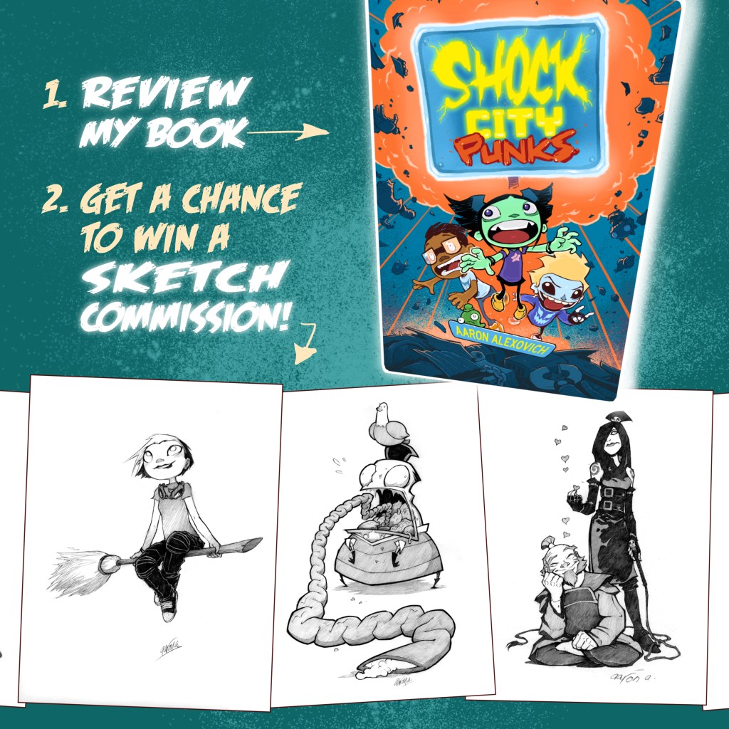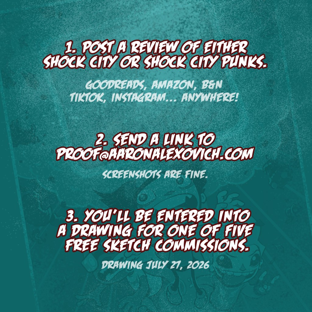 I very rarely do sketch commissions anymore, so here’s your chance! Post a review of SHOCK CITY or SHOCK CITY PUNKS on Goodreads, Amazon, TikTok, or anywhere else, and you’ll get a chance to win one of five pencil sketches of any character you want (up to two), free of charge, shipping included. Just send a link or screenshot to PROOF@aaronalexovich.com. Winners will be chosen on July 27th.
